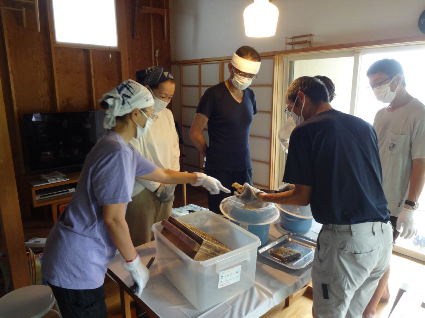 養蜂スクールでは巣箱を手作りし、野生のニホンミツバチを巣箱に呼ぶところから実践します。取材に訪れた日は、蜂蜜の採取から試食までを行いました。まず、巣の蜜が貯められている部分を慎重に切りだします。丁寧に作業する様子は、みつばちを驚かせたり傷つけたりしないようにする深い配慮と愛情を感じます。