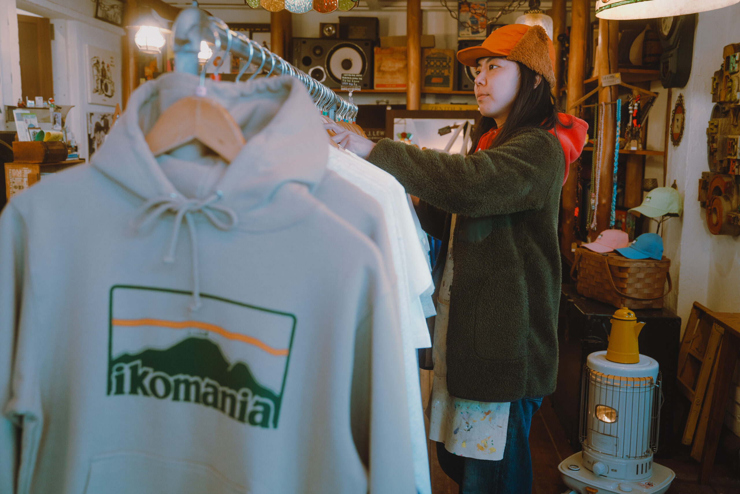 参道の風景と異国の空気が自然に溶け合う、そんなユニークなikomaniaを支えているのが、店主のアキさんです。関東で生まれ育ち、アパレル業界で服やモノづくりに向き合ってきました。その後、一時は海外に生活拠点を移し、多様な文化や価値観に触れる経験を重ね、日本に帰国。仕事の舞台は関西へ移り、巡り合わせた人々との縁に導かれるように、ikomaniaの店先に立つことになりました。